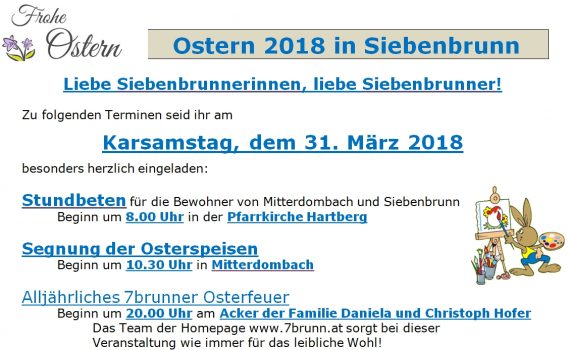Ostern in Siebenbrunn verläuft immer sehr traditionell. Am Samstag gehen die Dorfkinder Weihfeuertragen, dann treffen sich die Dorfbewohner beim Stundbeten, der Fleischweihe und zum Osterbier […]